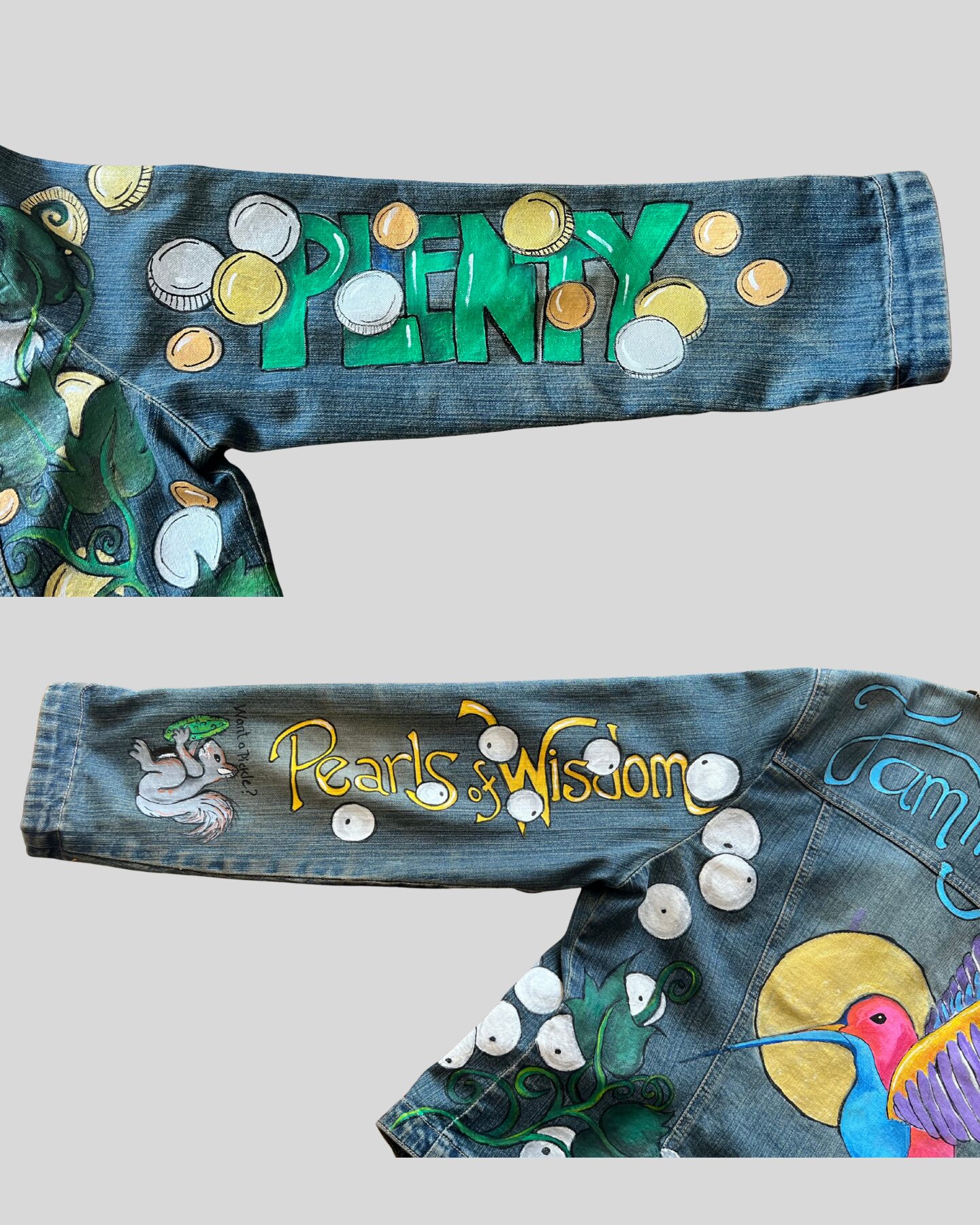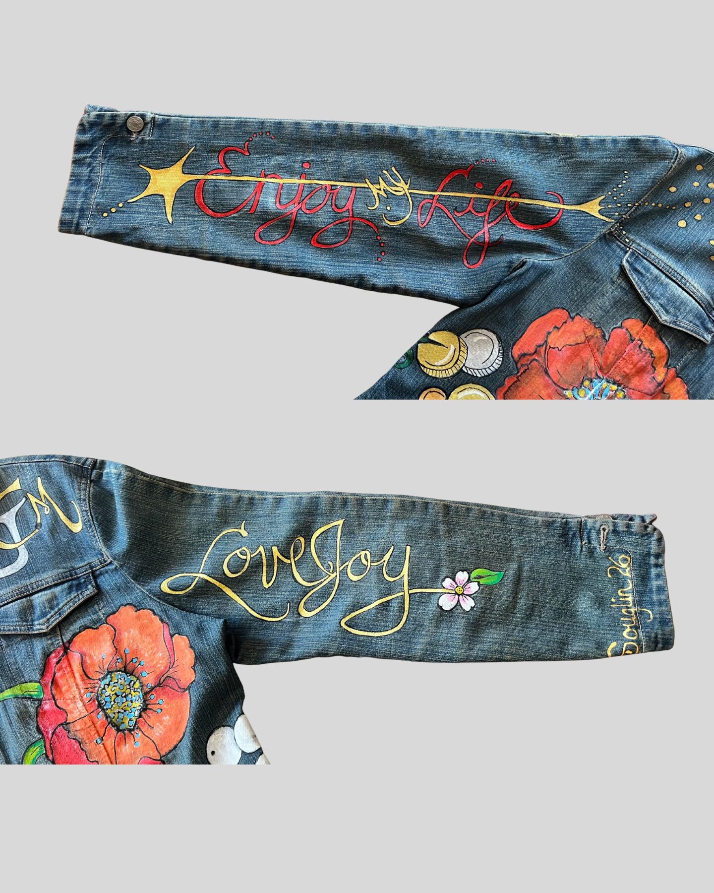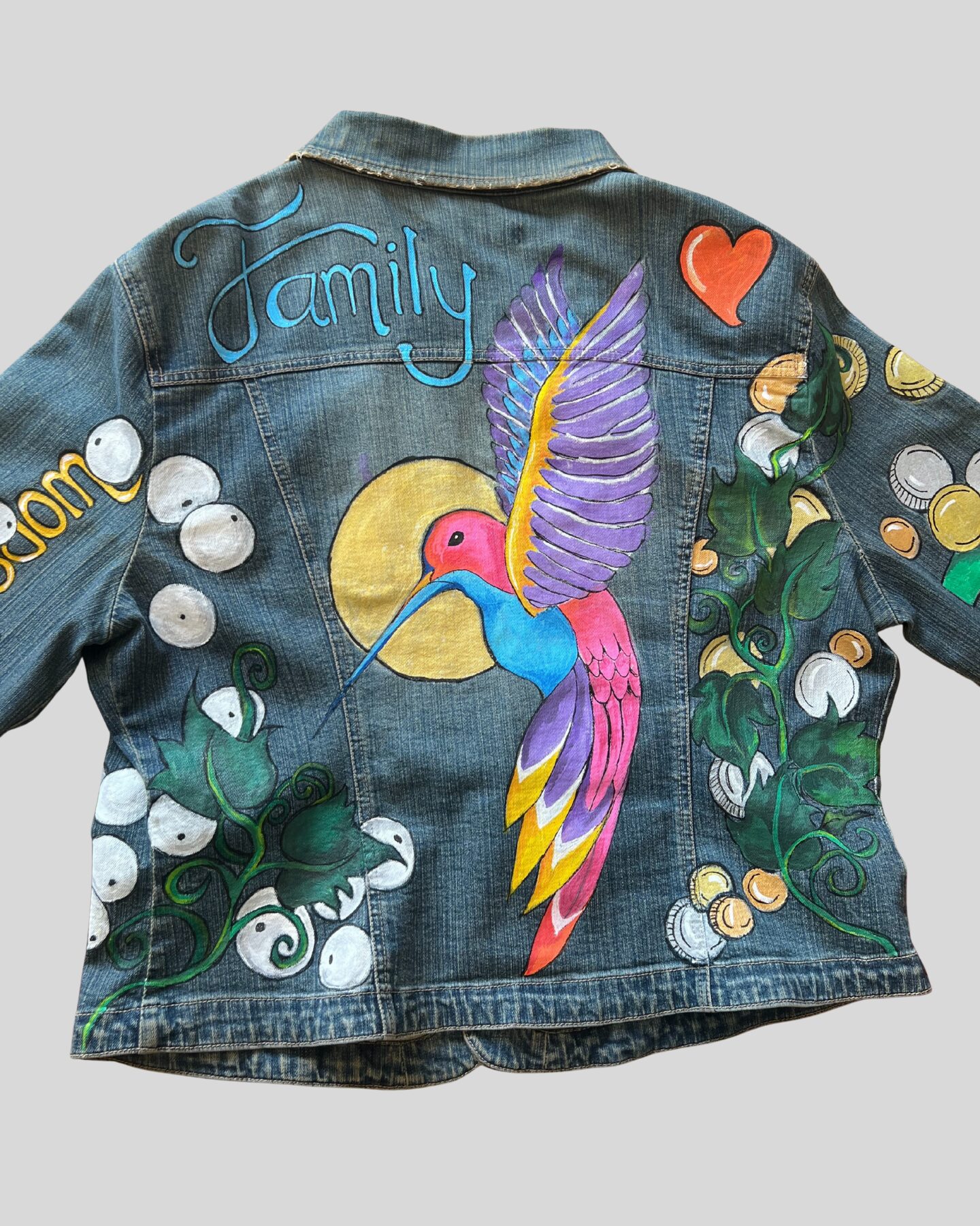 Sylvia paints every jacket entirely by hand. No two are the same because no two people are the same. When it’s done, it’s wearable art with a story baked into every brushstroke.